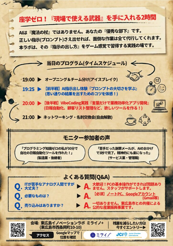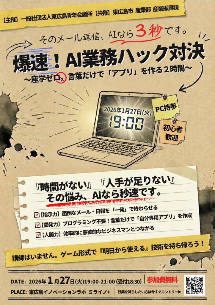 【東広島青年会議所共催企画】爆速!AI業務ハック対決~座学ゼロ。言葉だけで「アプリ」を作る2時間~
