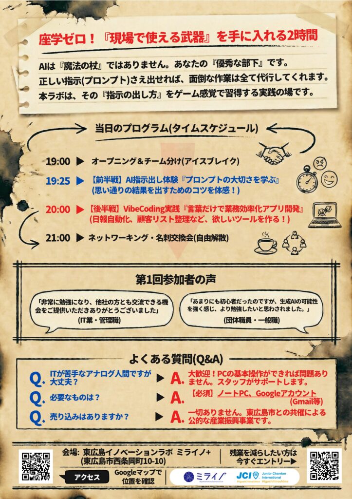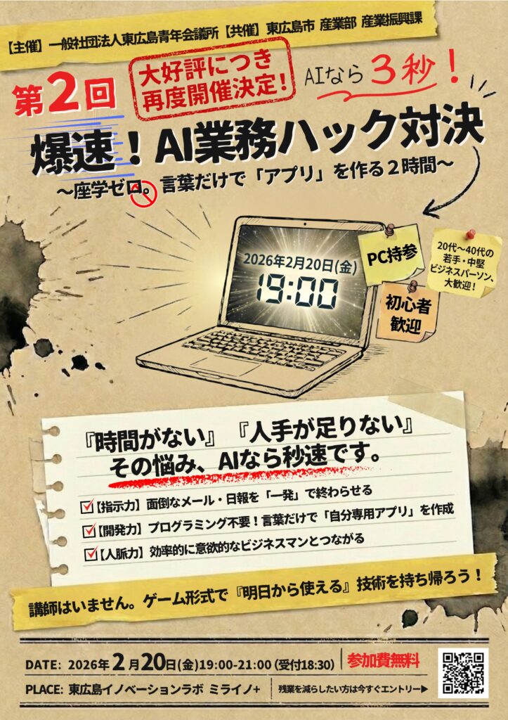 【東広島青年会議所共催企画】<好評につき再度開催>爆速!AI業務ハック対決~座学ゼロ。言葉だけで「アプリ」を作る2時間~