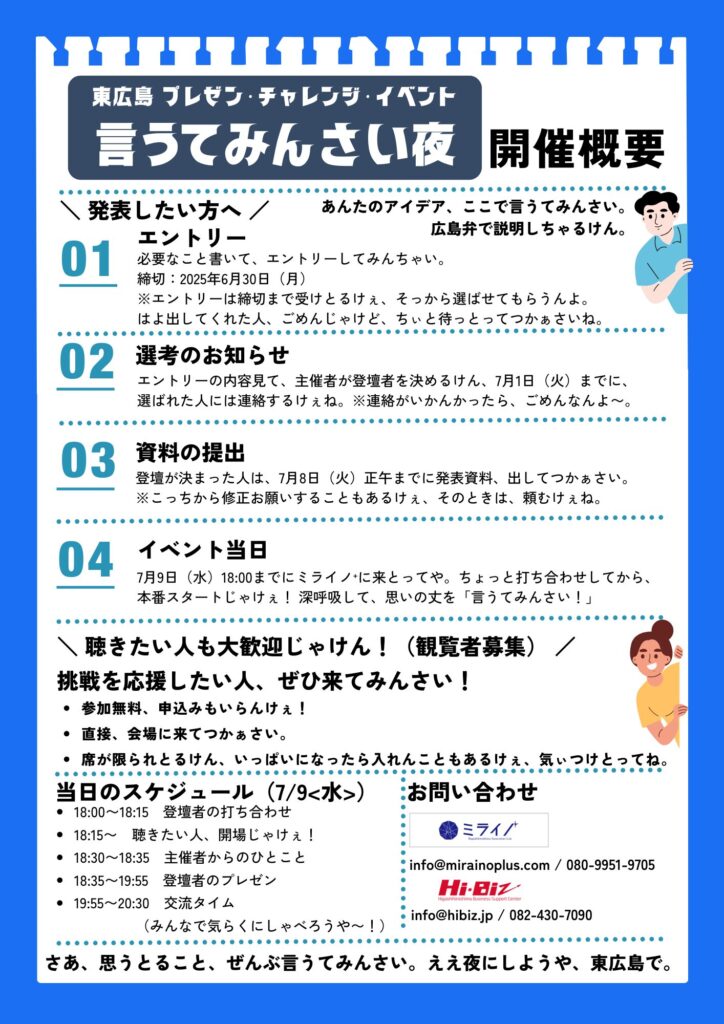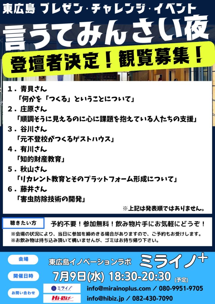 テーマ『言うてみんさい夜2025「夏」』は、東広島ビジネスサポートセンターHi-Biz、東広島イノベーションラボミライノ⁺共催による、プレゼンテーション&交流イベントです。