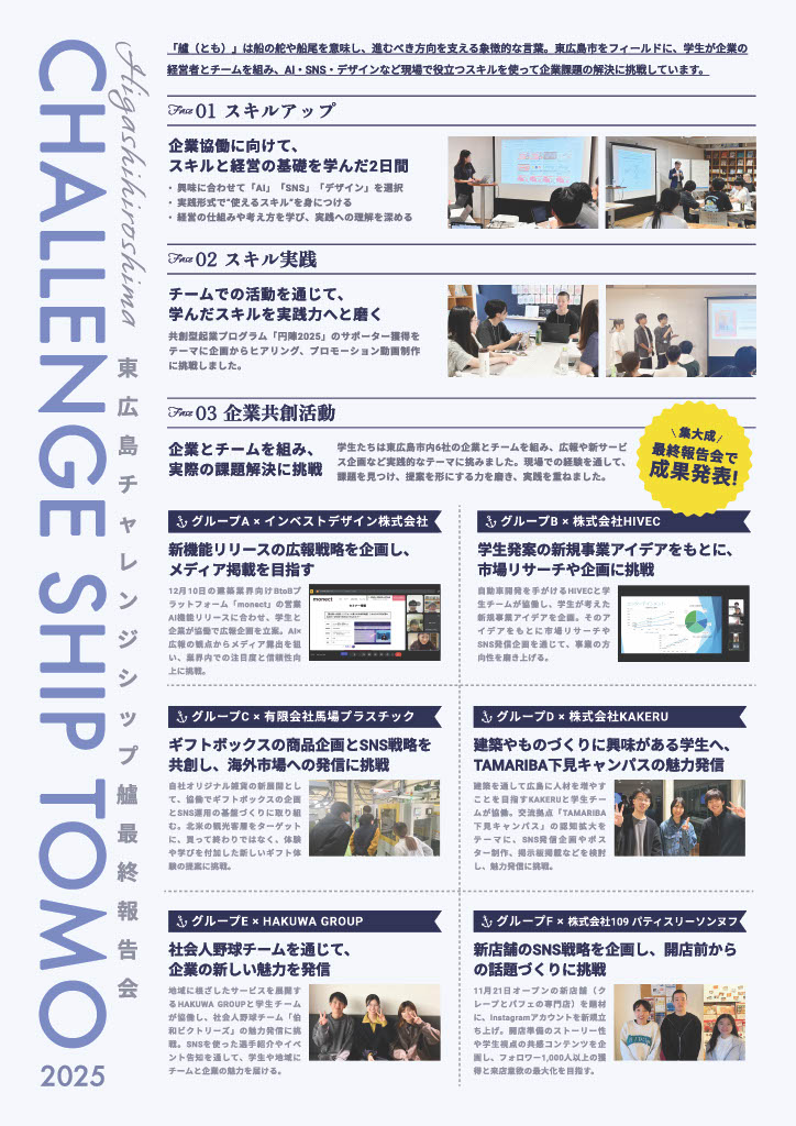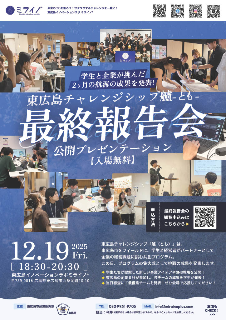 東広島市をフィールドに、学生と経営者がパートナーとして企業の経営課題に挑む共創プログラム「東広島チャレンジシップ-艫-(とも)」の集大成として、最終報告会を開催します!