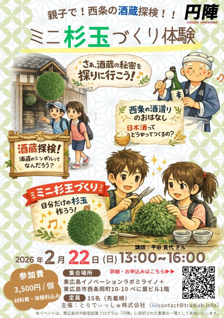 このワークショップでは、小学生のみなさんを対象に、日本酒のまち・西条の酒蔵通りを歩いて見学したあと、実際に手を動かして「ミニ杉玉づくり」にチャレンジします!