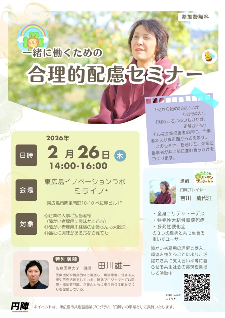 また当日は、広島国際大学の田川教授をお迎えし、合理的配慮の基本的な考え方や背景についての講義も予定しています。