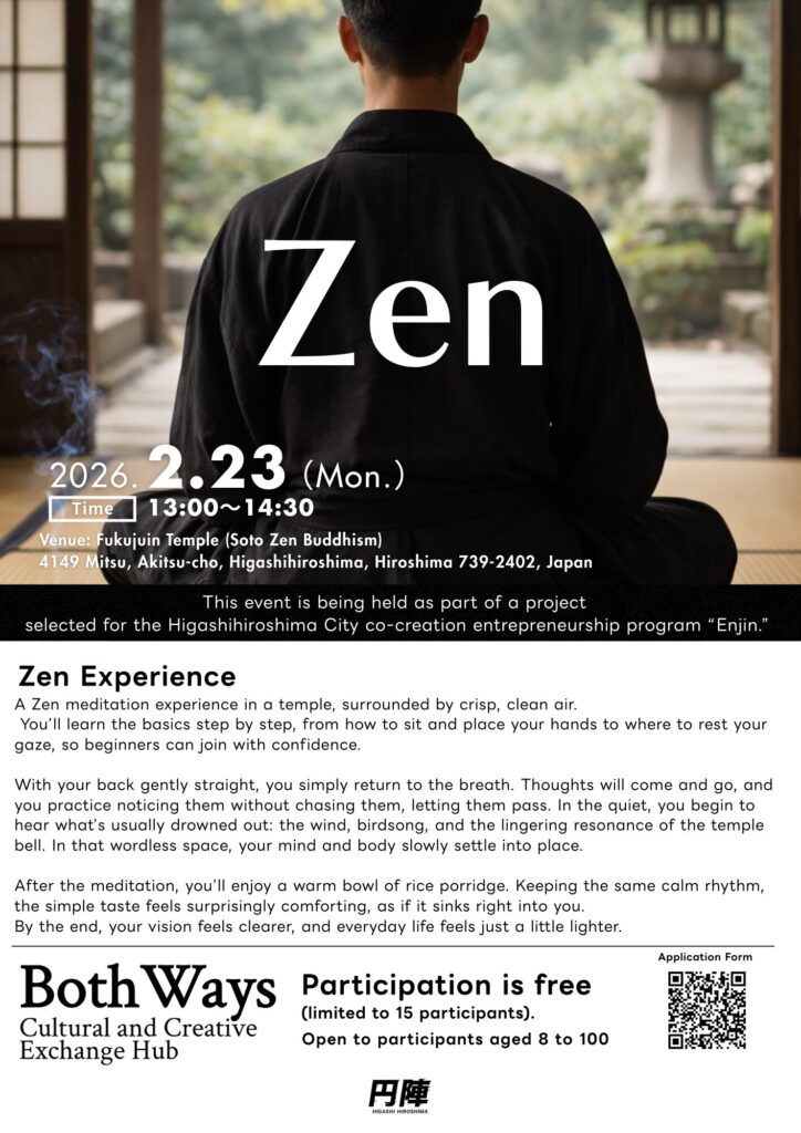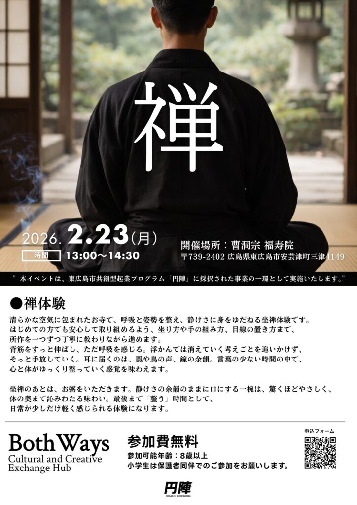 2月23日(月・祝)に、円陣プロジェクト「Both Ways」の取り組みの一環として、体験型ワークショップ「禅体験」を開催します。