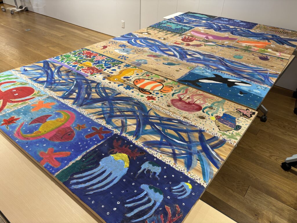 各自が割り当てられたスペースに自由にペインティングを行い、その後、全体のバランスを確認しながら、テーブル一台ごとに一つの作品として仕上げていきました。