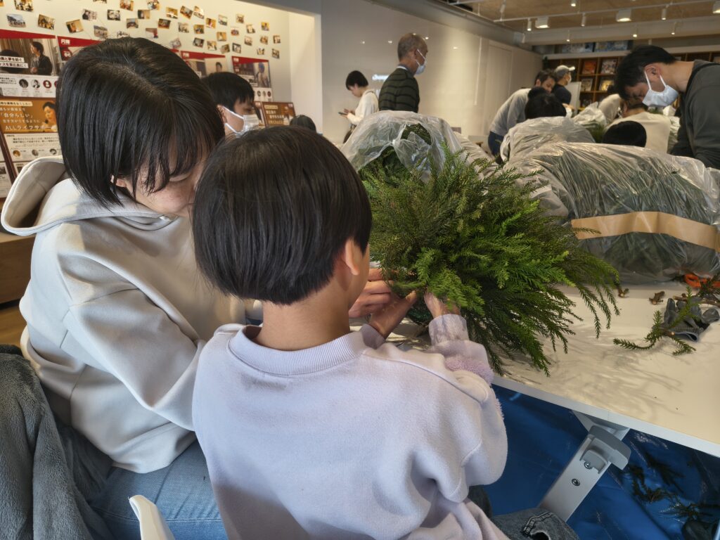 杉の葉の爽やかな香りに包まれながら、親子で協力して作品づくりに取り組む姿が印象的でした。